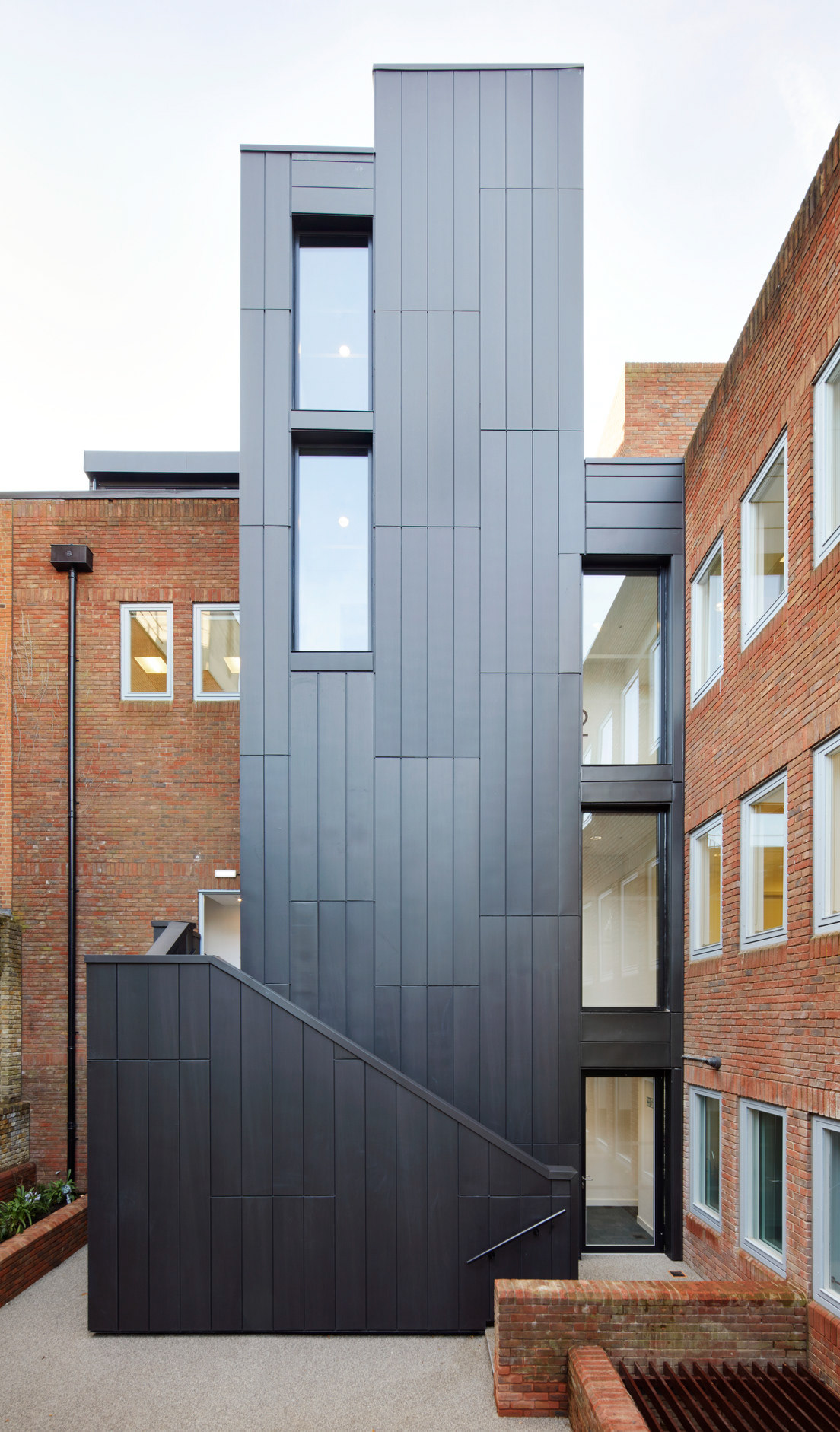 The aim of the project was to carry out a light refurbishment to the existing building that included modifications to the reception, outdoor space and the core & sanitary block. The scope also included the installation of a new zinc cladded lift in the rear courtyard and a new fire exit for the basement. At the third floor an extension is proposed adjacent/facing George Street which is the main shopping street of Richmond.